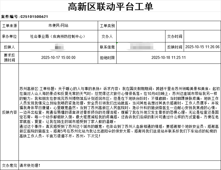 一直以来,苏州高新区人民医院始终坚持以患者为中心,致力于为每一位患者提供专业、温暖、高效的医疗服务。此次游客的表扬,既是对医院工作的肯定,也是对全体医护人员的激励。未来,医院将继续提升服务水平,用实际行动践行“医者仁心”的使命,用更多的暖心举措,擦亮苏州这座城市的温情底色,让“苏州温度”在医患之间持续传递与升华。