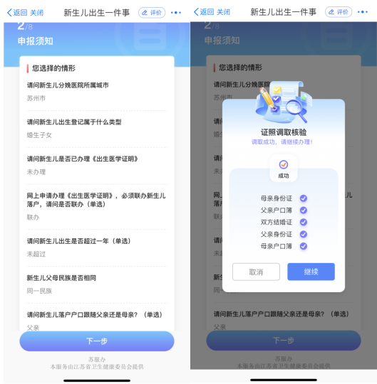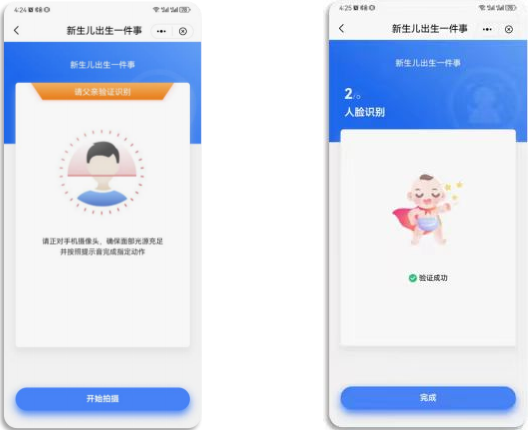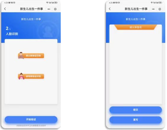 进入人脸识别界面,选择婴儿父亲/母亲人脸验证识别, 并签名, 需夫妻双方均参与识别签名。申请人完成签名后,通知配偶,打开苏服办,根据提示,开始人脸识别签字,配偶登录苏服办APP(或支付宝小程序),进入新生儿出生一件事,系统会自动提示已有办件申请,需配合确认表单并人脸识别,点击确定进入表单确认界面,表单确认无误后,点击下一步,开始配偶的人脸识别,脸识别并签字成功后,配偶操作即结束,通知申请者继续申报
