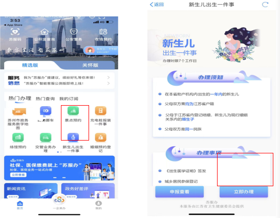 2、打开APP,进入“苏服办”app,通过婚育养老主题,查找出生一件事,进入新生儿出生一件事界面,阅读公示内容,了解办理限制要求并满足时,点击立即办理。