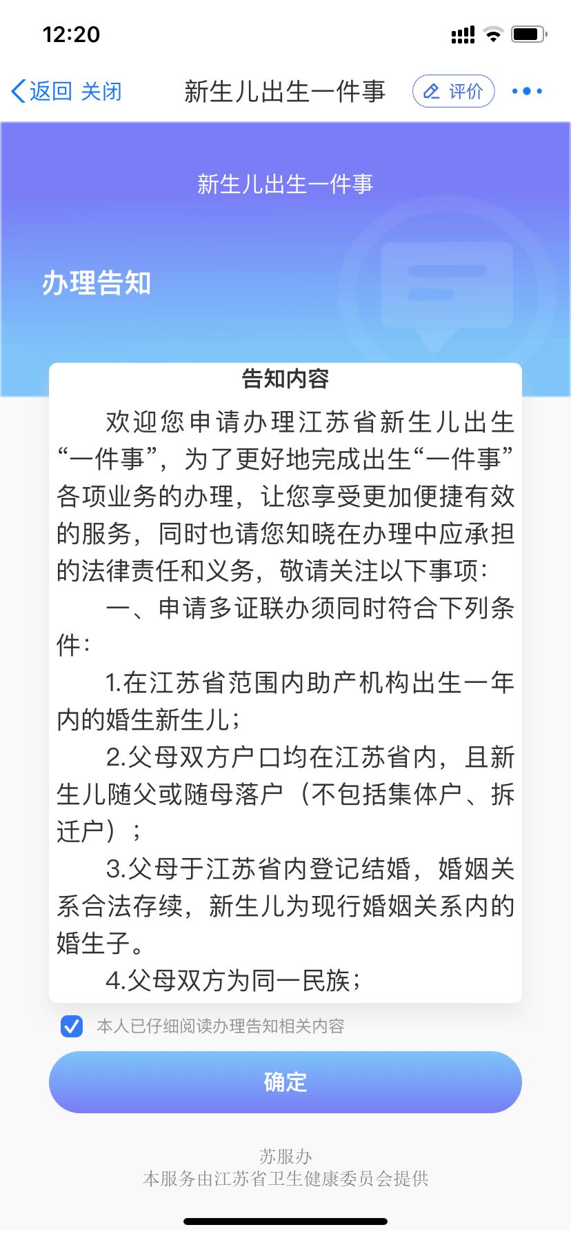 3、详细阅读江苏省出生一件事告知条例,阅读完成并接收后,勾选“本人已仔细阅读办理告知相关内容”,点击确认