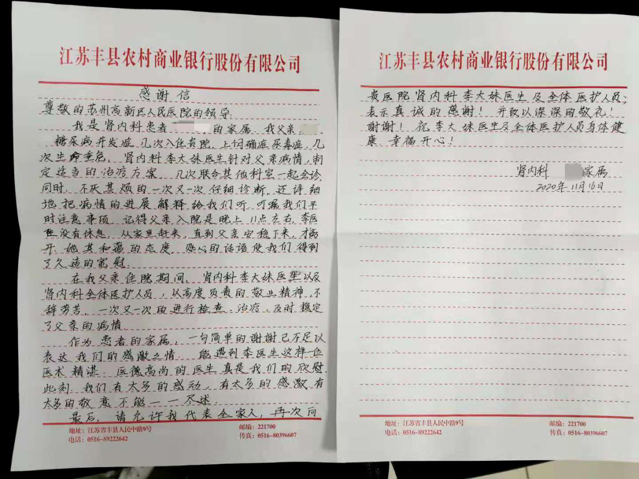双十一,孙老伯出院了。一共超滤掉十几公斤水,心衰缓解,能吃能睡,他笑称:“别人双十一抢购的是商品,我抢购的是最宝贵的健康,还是我赚了!”刚住院的时候,坐在病床上吸着氧气都上气不接下气;现在透析结束了,自己拄个棍走出来,开个小三轮车回家,与治疗前后判若两人。他一看见医生就要说:“我的命都是你们救过来的,谢谢你们!”孙老伯的女儿也感激地从苏北老家寄来了家乡特产——无公害苹果,并附了一封感谢信,感谢高新区人民医院救了她老爸,还祝肾内科血透的医务人员都平平安安。