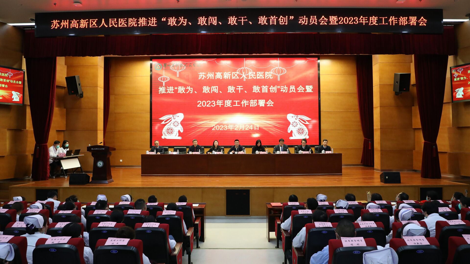 为进一步深入学习贯彻中央、省委、市委和区委关于“四敢”的部署要求,2月24日下午,苏州高新区人民医院召开贯彻落实“敢为、敢闯、敢干、敢首创”动员会暨2023年度工作部署大会。区党工委委员、宣传部部长李志军、区社会事业局党委书记、局长范晓晔、副局长潘凌出席会议,我院全体领导班子成员、中层干部、受表彰人员及科室代表参加了会议。