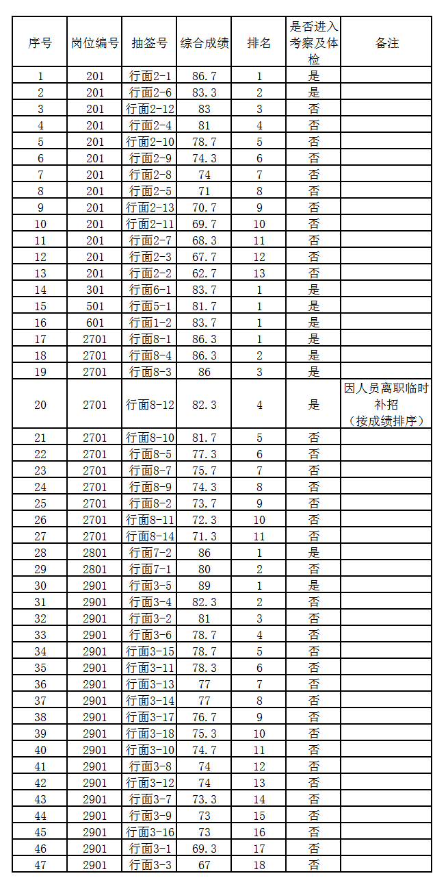 注:1、经讨论通过,“0401”、“0402”岗位因工作地点原因另外择期公示。