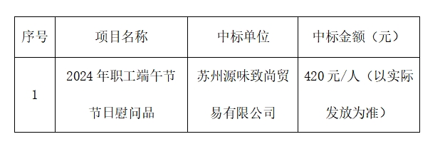 我单位于2024年5月24日对 2024年职工端午节节日慰问品招标项目进行了公开采购招标。现就本次采购的中标、成交结果公告如下: